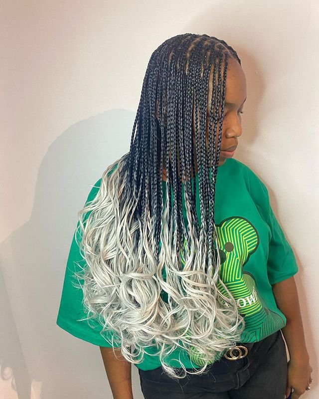 This striking hairstyle features black box braids that seamlessly transition into icy blonde French curls. The stark contrast between the dark roots and platinum ends makes this look truly stand out. To recreate this style, braid the hair from the roots and leave the ends loose.