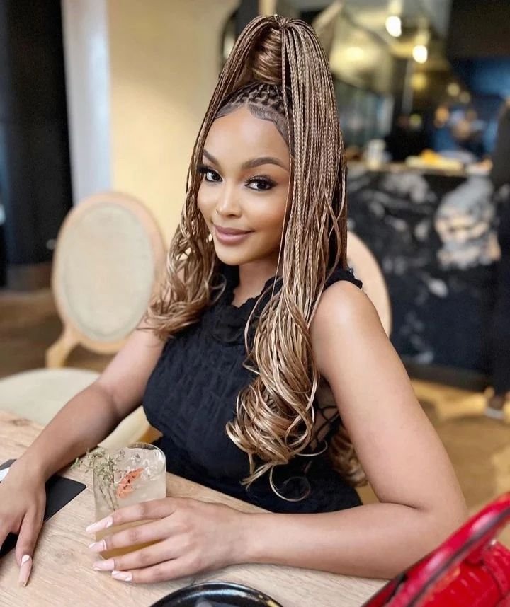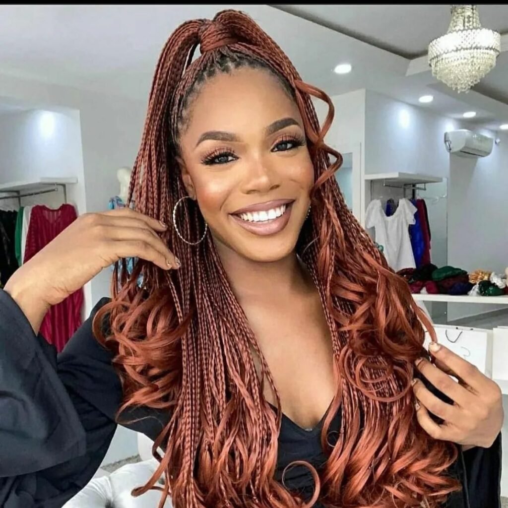 This hairstyle features auburn-colored box braids that transition into loose, bouncy French curls at the ends. The high ponytail adds an element of fun and versatility, making it a great option for a day-to-night look. To achieve this style, braid the hair from the scalp down to mid-length, leaving the ends unbraided.