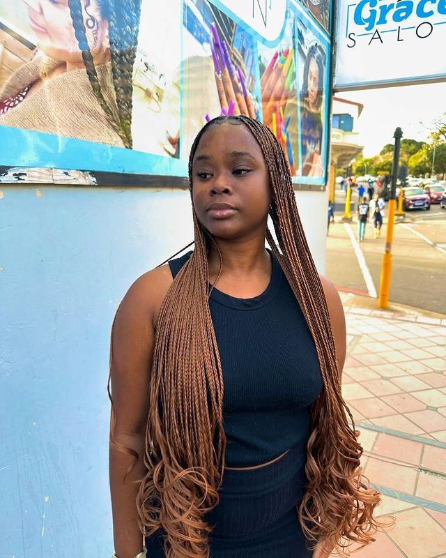 To achieve this style, braid the hair from roots to mid-length and leave the ends unbraided for curling. Using a curling iron or flexi rods, create loose curls to finish off the ends for a natural yet glamorous look. This hairstyle is perfect for anyone wanting to add a chic, playful element to their braids.