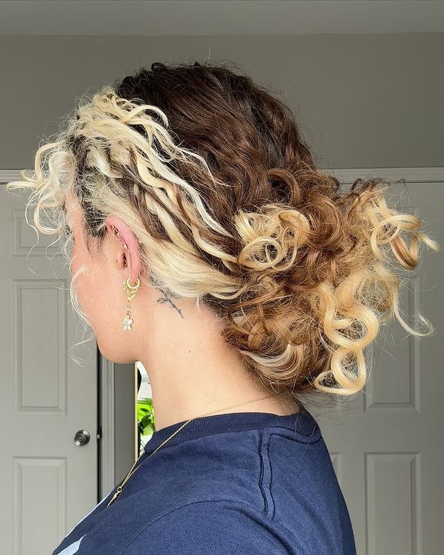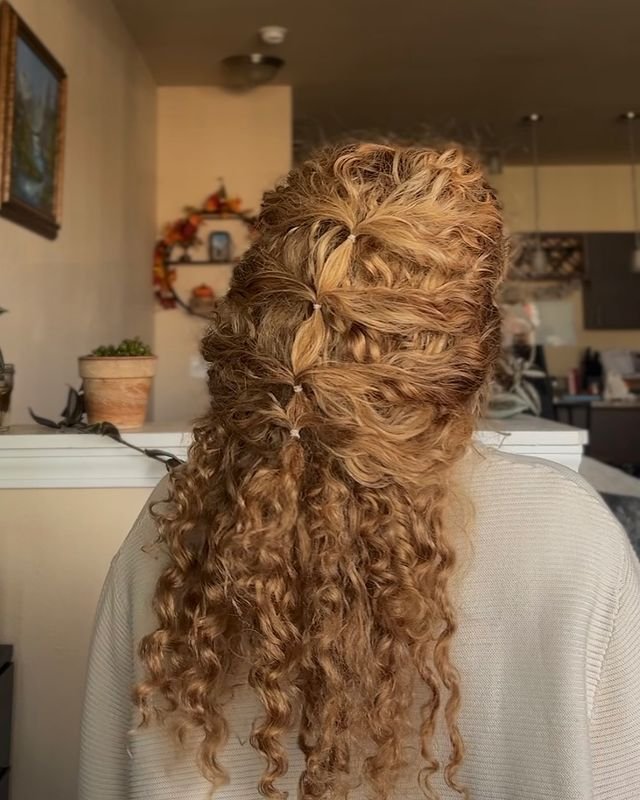 This half-up, half-down style combines golden blonde curls with a simple twisted half-up section at the crown. The twists add a subtle detail to the hairstyle, while the curls give the look volume and texture.