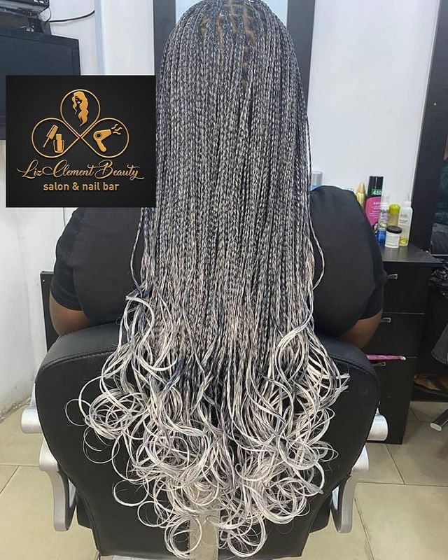 This bold hairstyle features grey ombre box braids that lead into flowing French curls at the ends. The dark-to-light ombre effect makes the curls stand out even more, offering a striking visual contrast.