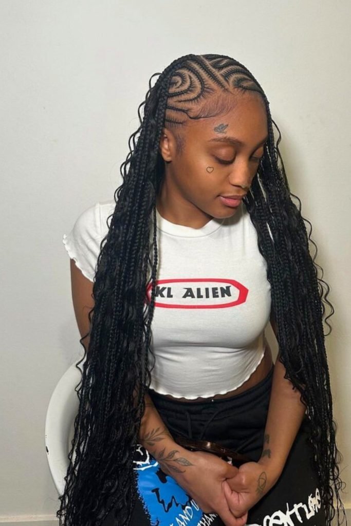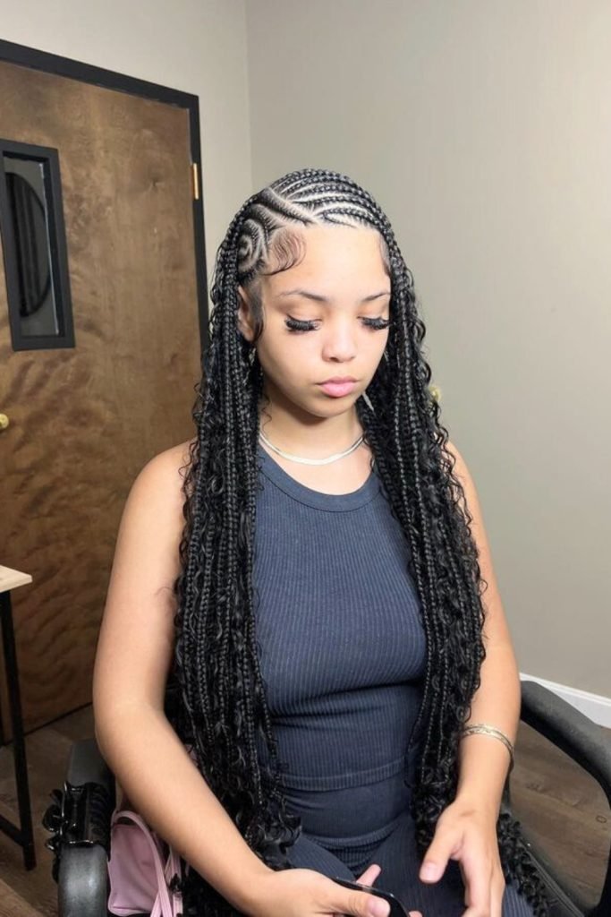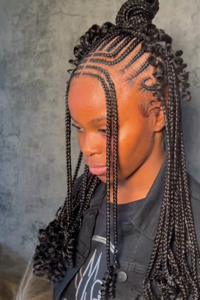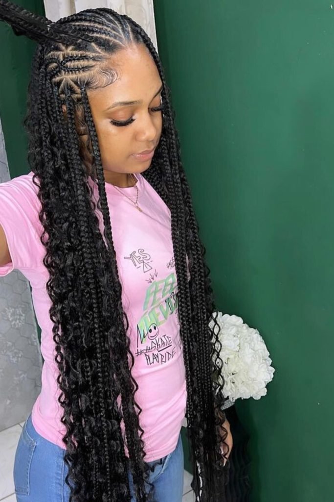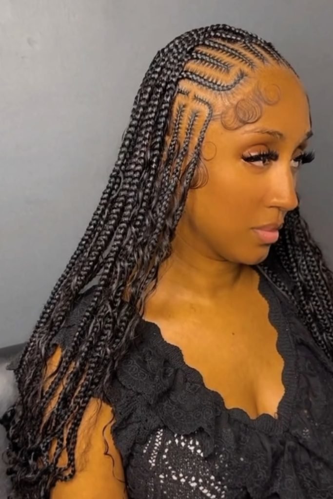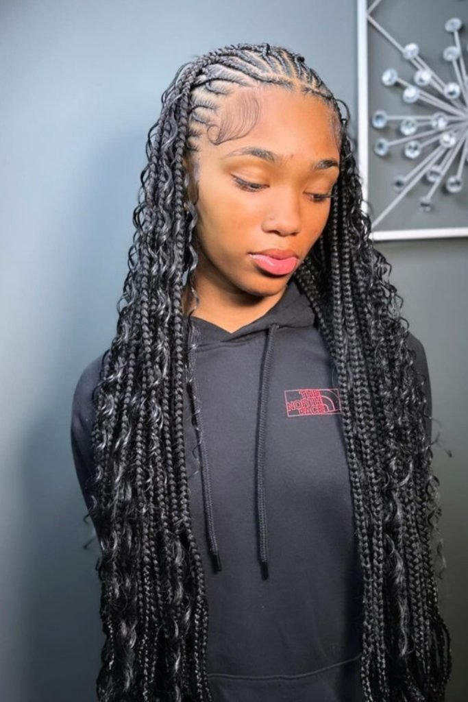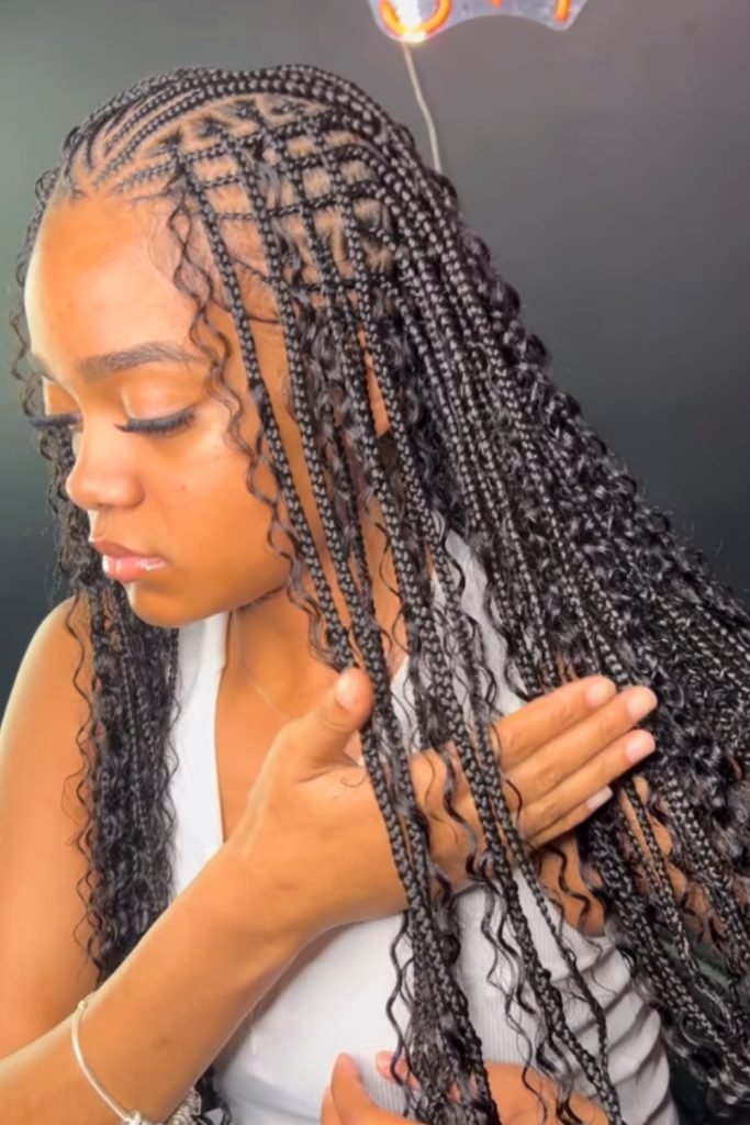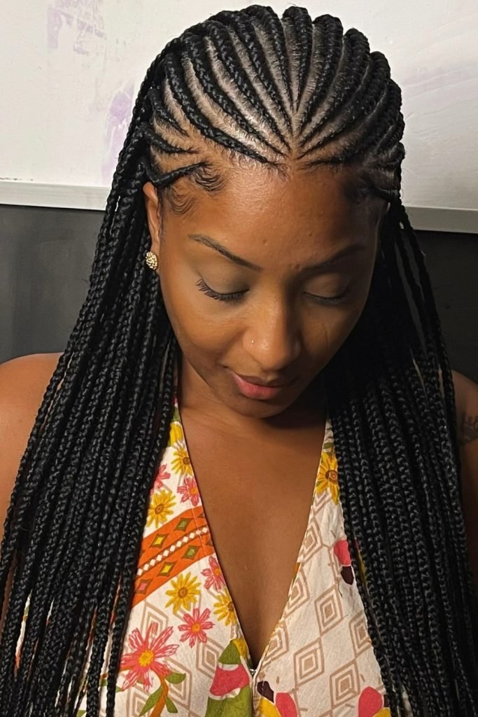 This style starts with neatly parted cornrows that are meticulously braided close to the scalp, then transition into long, free-hanging braids.