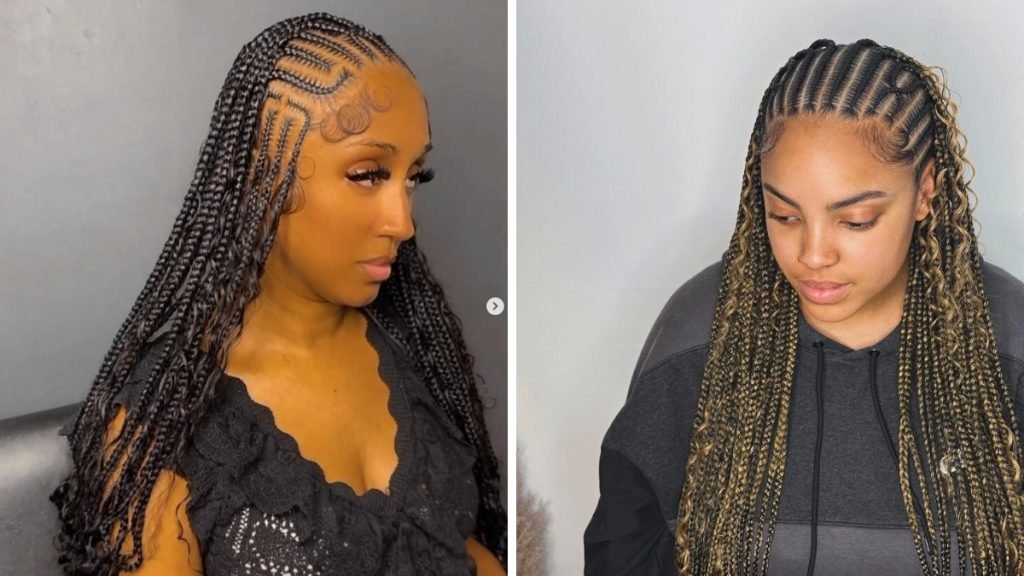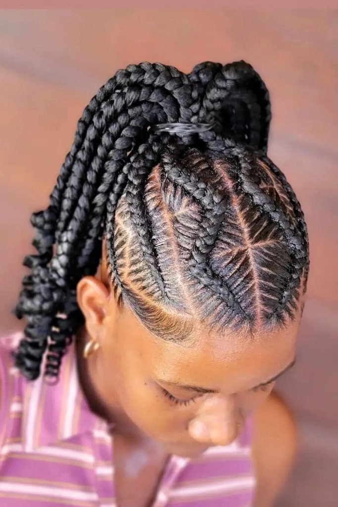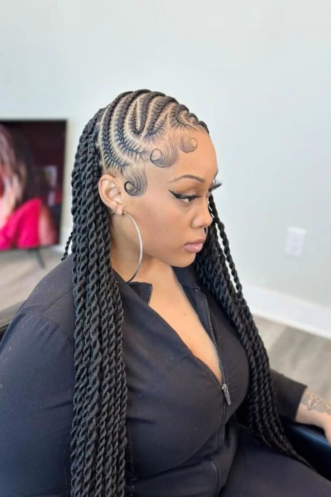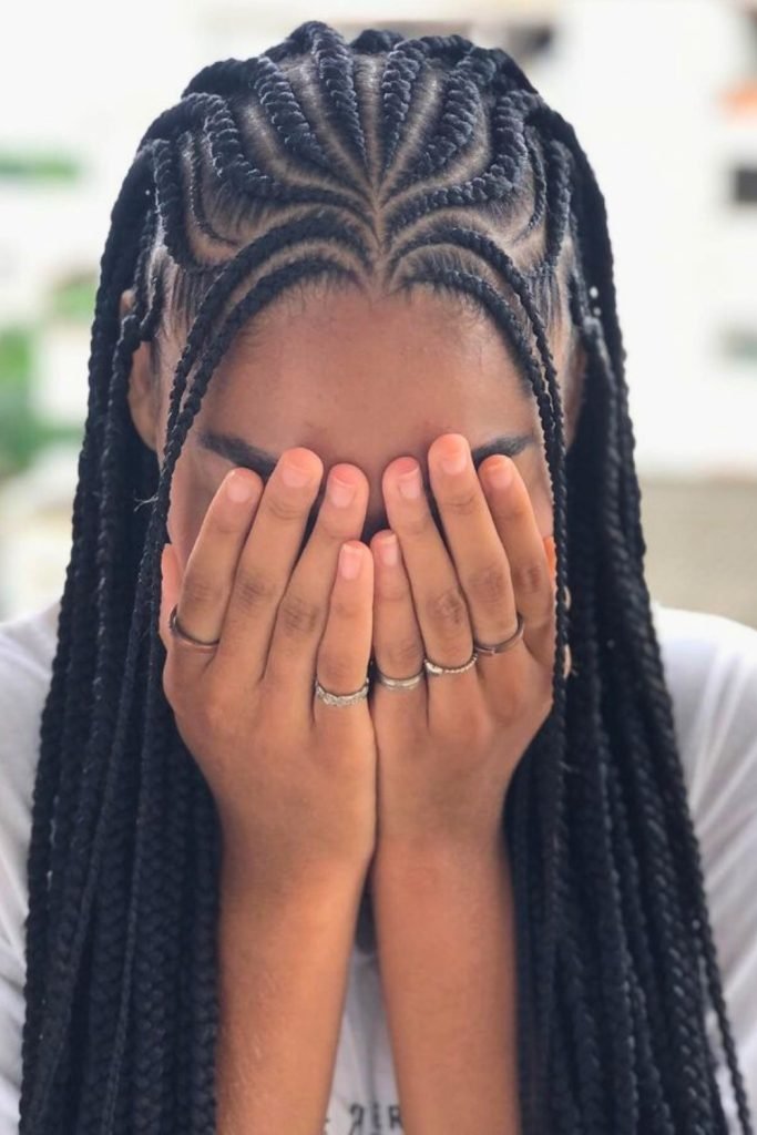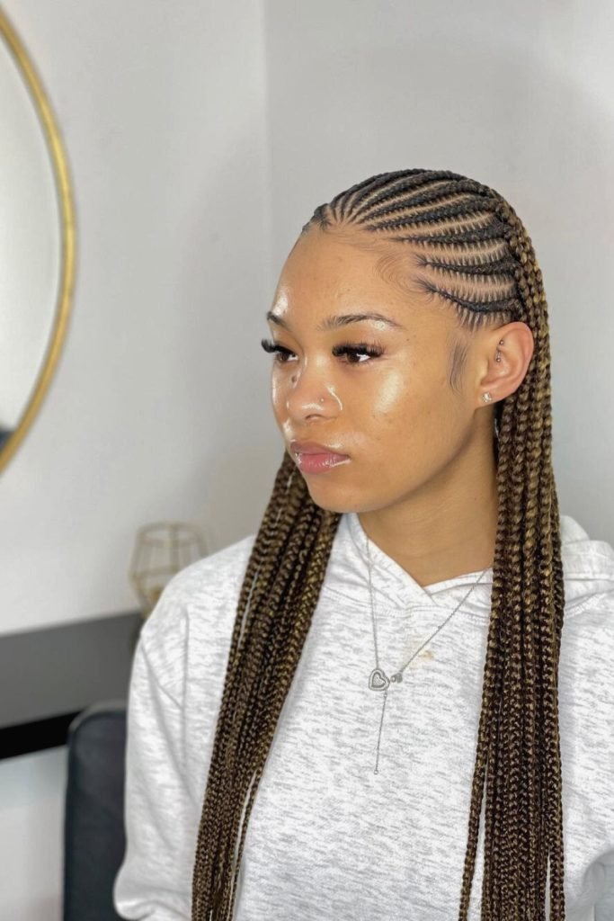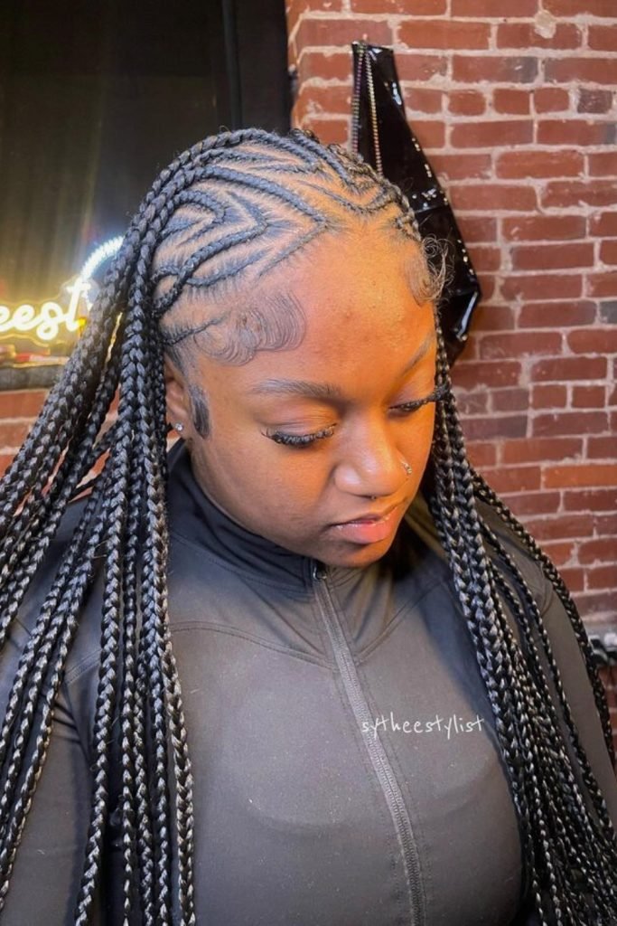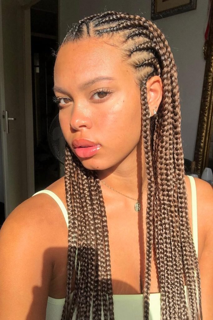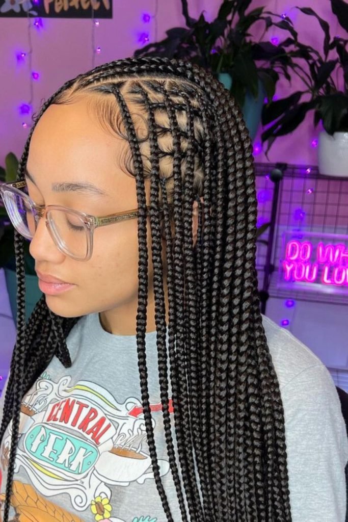 This style starts with neatly parted cornrows that are meticulously braided close to the scalp, then transition into long, free-hanging braids.