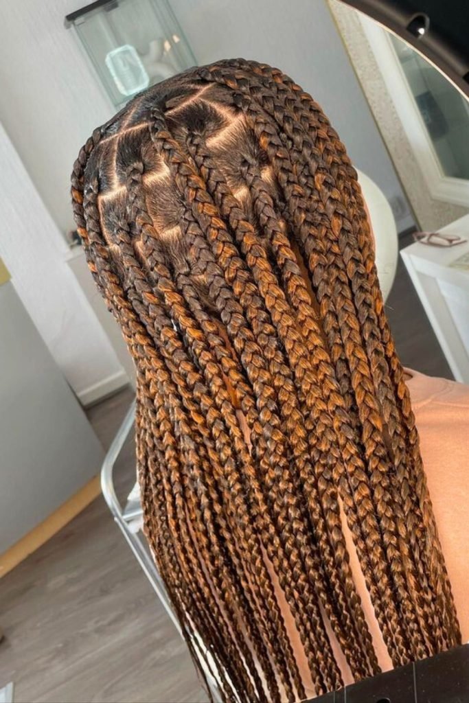 The hair is parted into clean, box-shaped sections, each braid meticulously crafted for a uniform appearance.