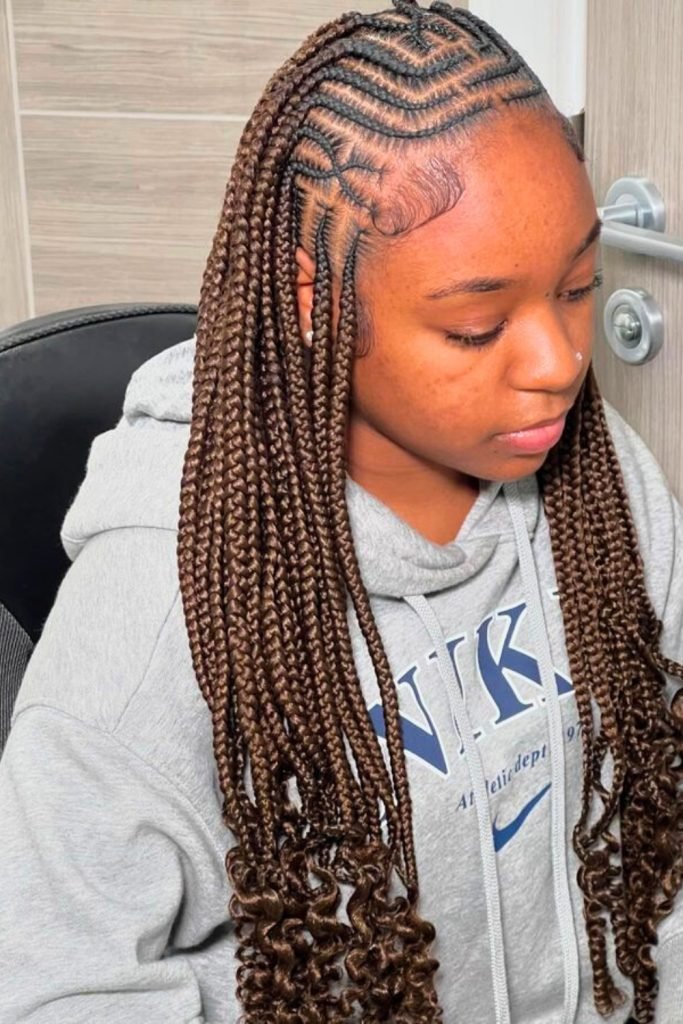 Side-parted Fulani Braids with Curls create a stunning and versatile look.