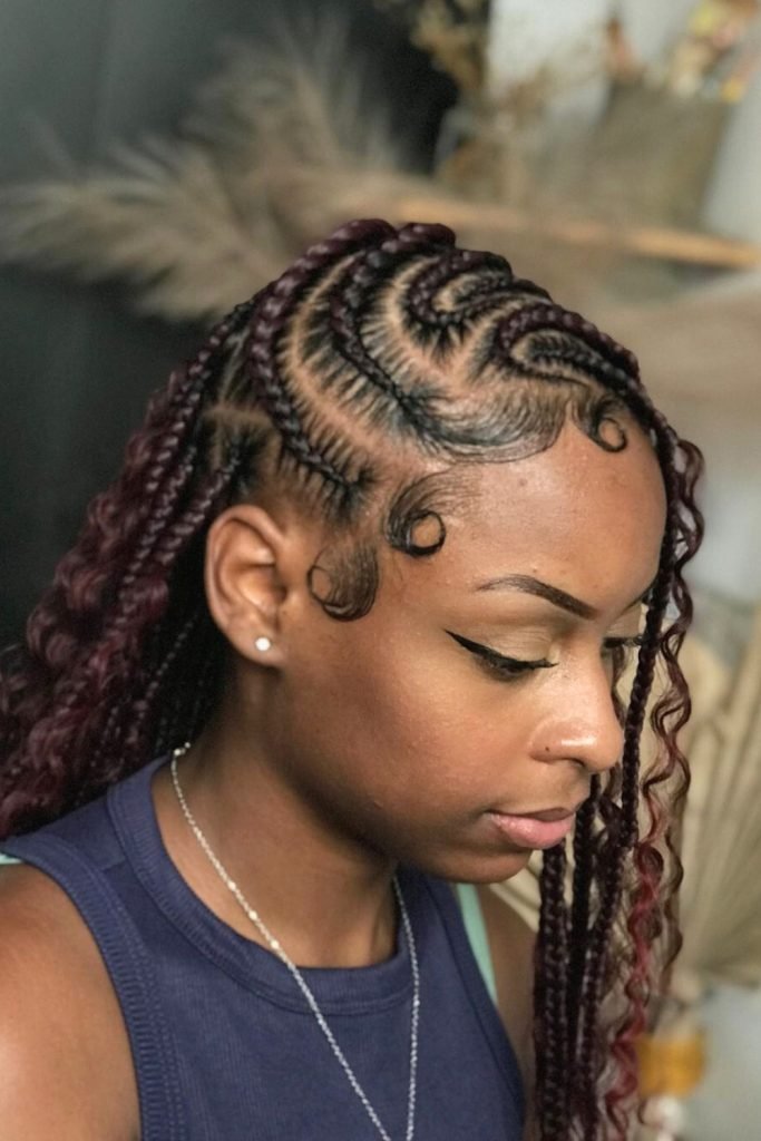 The braids are arranged in intricate patterns on the scalp, highlighted by a rich burgundy hue that adds a bold and vibrant touch.