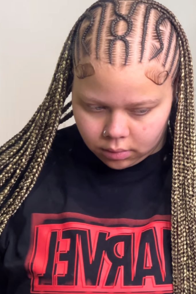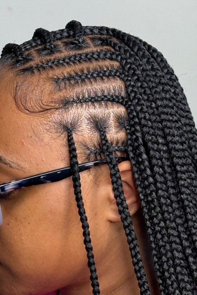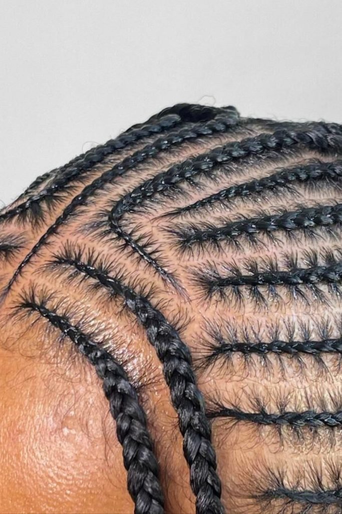 The braids are meticulously sectioned into sharp, angular parts that highlight the scalp’s natural contours.