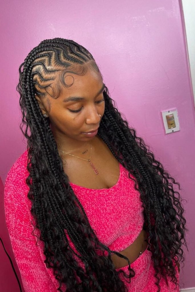 The braids are intricately patterned on the scalp, creating a visually appealing design that transitions into loose, bouncy curls at the ends.