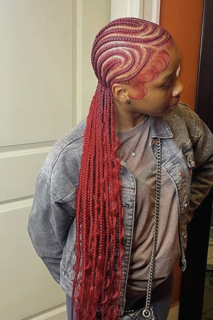 This style features bright red braids that cascade down the back, adding a pop of color and drama.