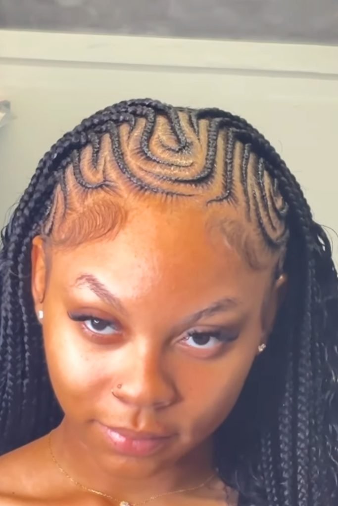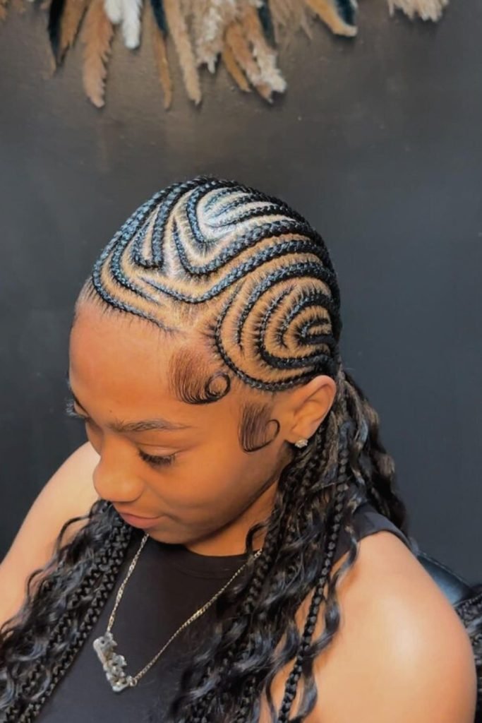 The braids are arranged in a beautifully curved pattern on the scalp, creating a dynamic and eye-catching effect.