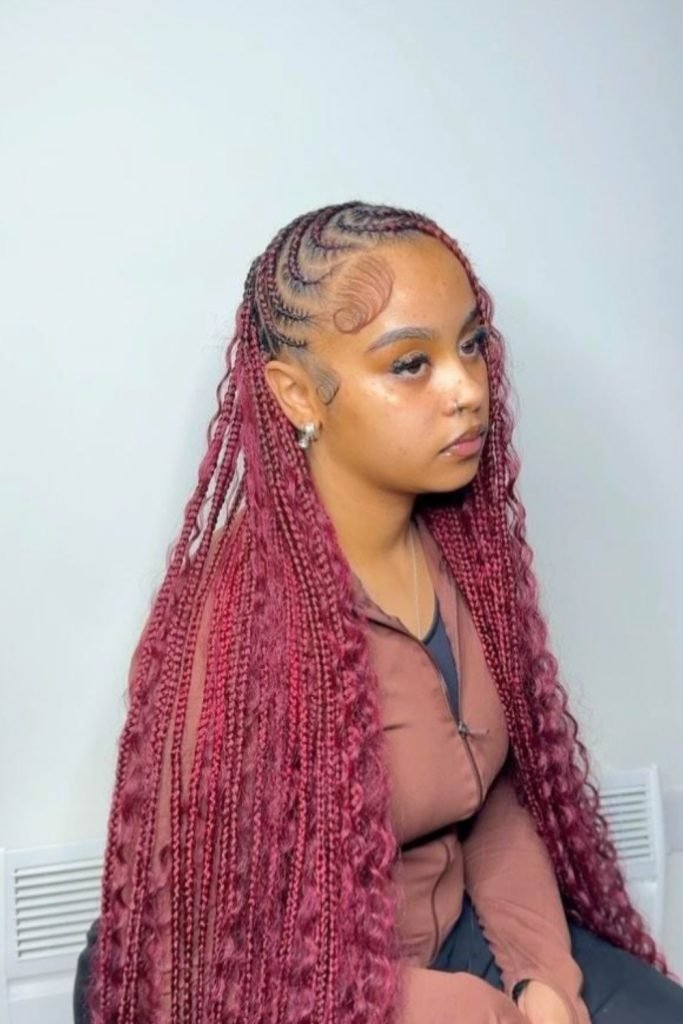 Burgundy Fulani Braids with Curls offer a stunning fusion of color and texture.