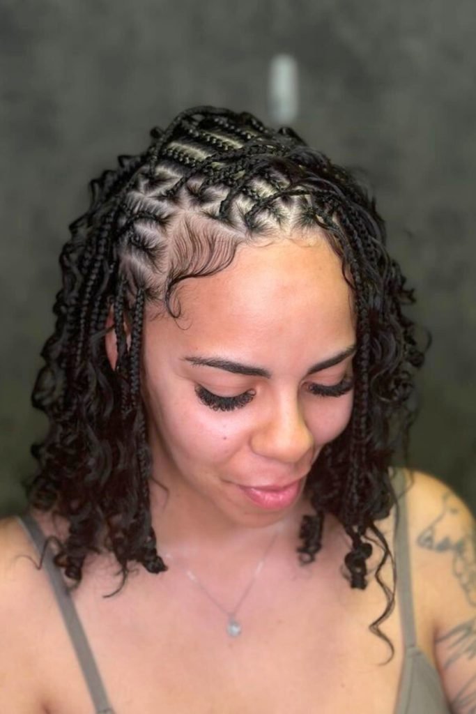 The ends of the braids transition into loose curls, providing a playful contrast to the structured braids.