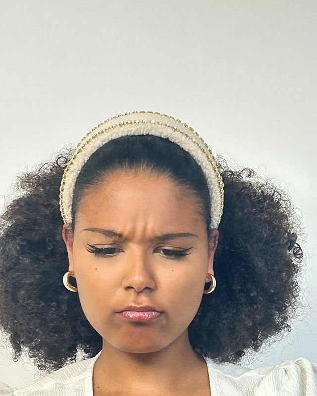 To recreate it, use a beaded fabric headband that sits just behind the hairline. The headband’s texture complements the curls, and the beads add a touch of elegance, making it a versatile option for casual outings or special occasions.