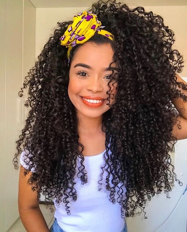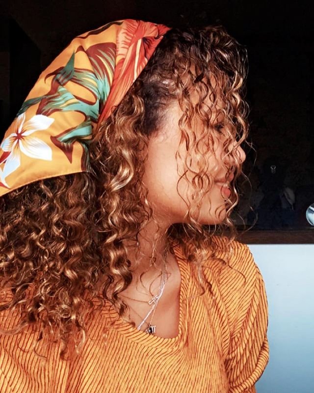 Ideal for full, dense curls, this hairstyle is perfect for those who want to add color to their look without compromising volume. Simply wrap a long scarf around the head, tie it at the top, and let the curls frame the face.