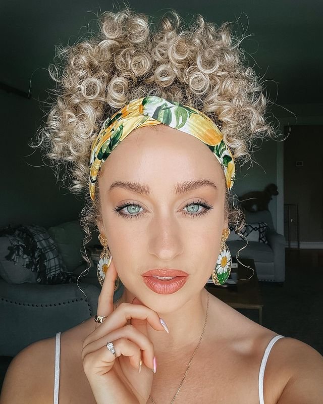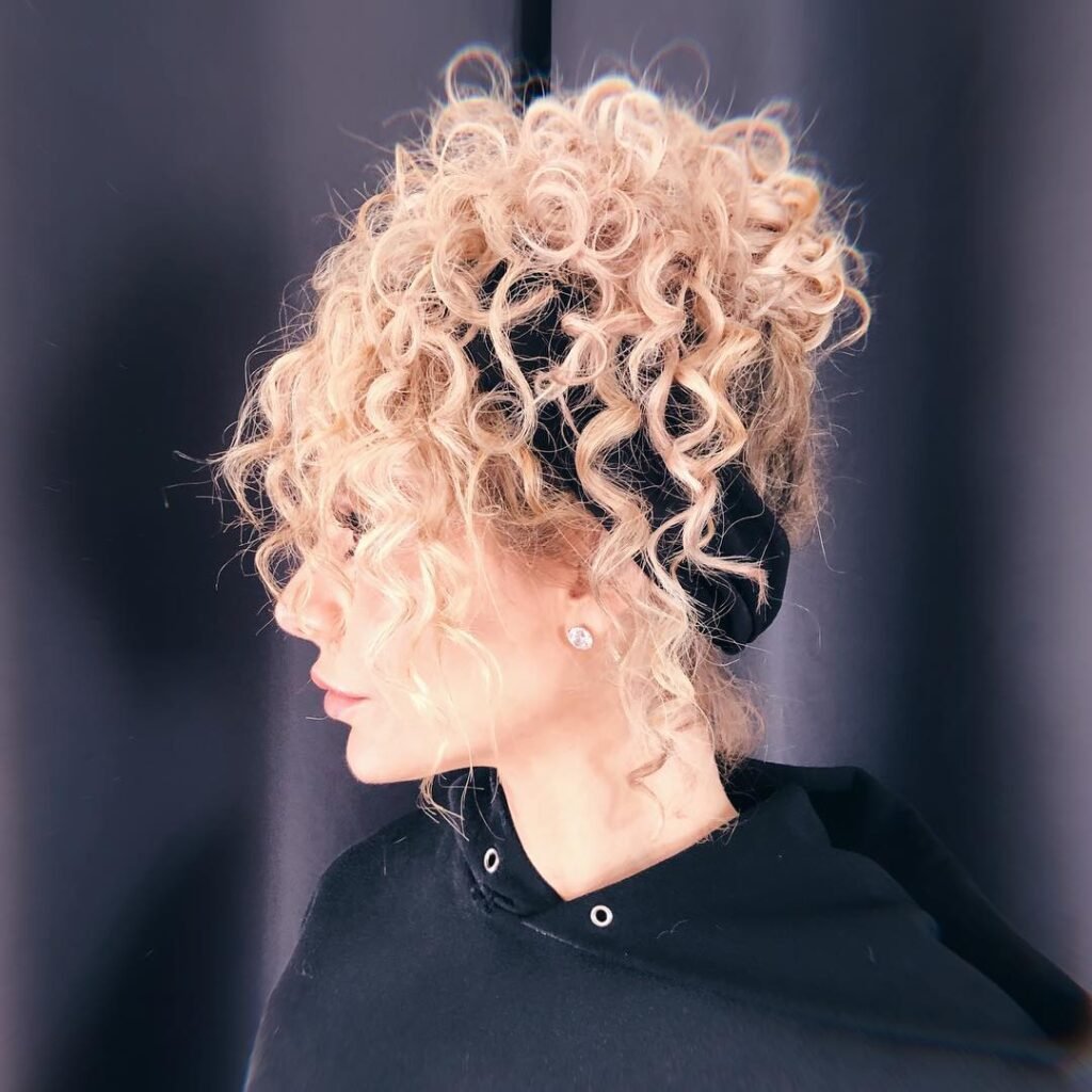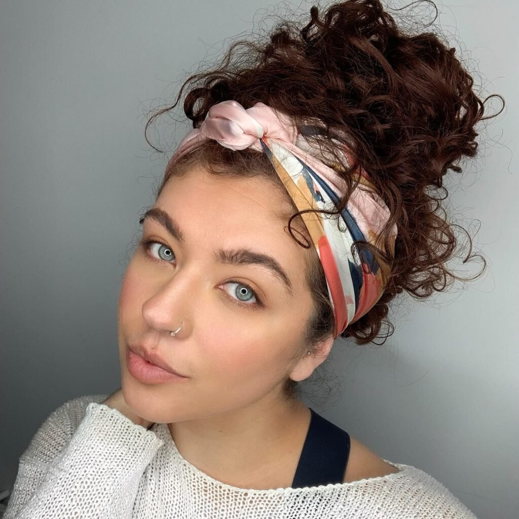 A printed scarf headband is wrapped around a high curly bun in this style, creating a chic, bohemian vibe. The scarf adds a pop of color and keeps the bun in place, making it ideal for a casual day out or when you want to keep hair off your neck.