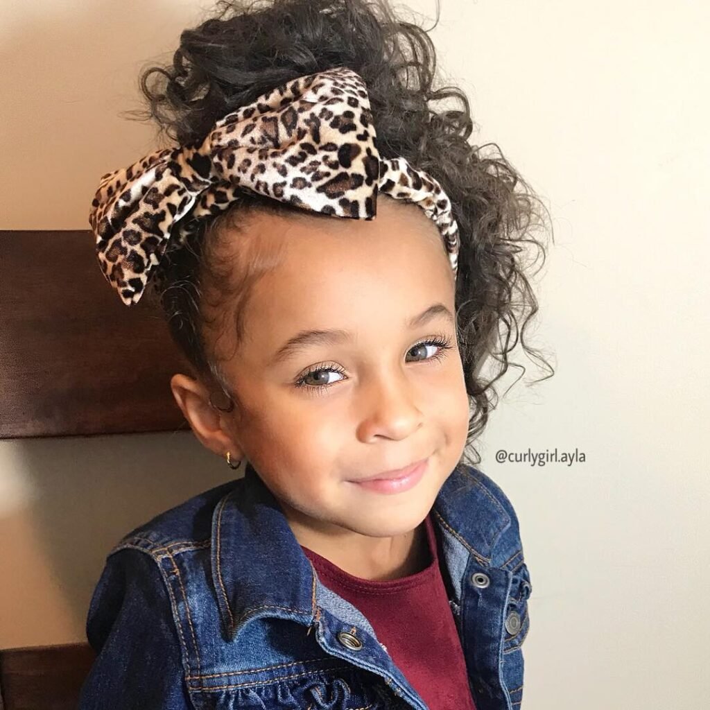 This playful look features a leopard print bow headband that holds up a high curly puff. The bold bow adds a touch of personality and keeps the hair out of the face, making it a practical yet stylish choice for kids and young adults.