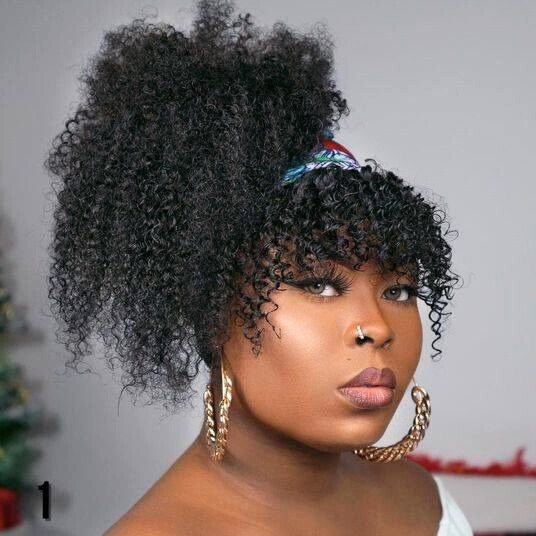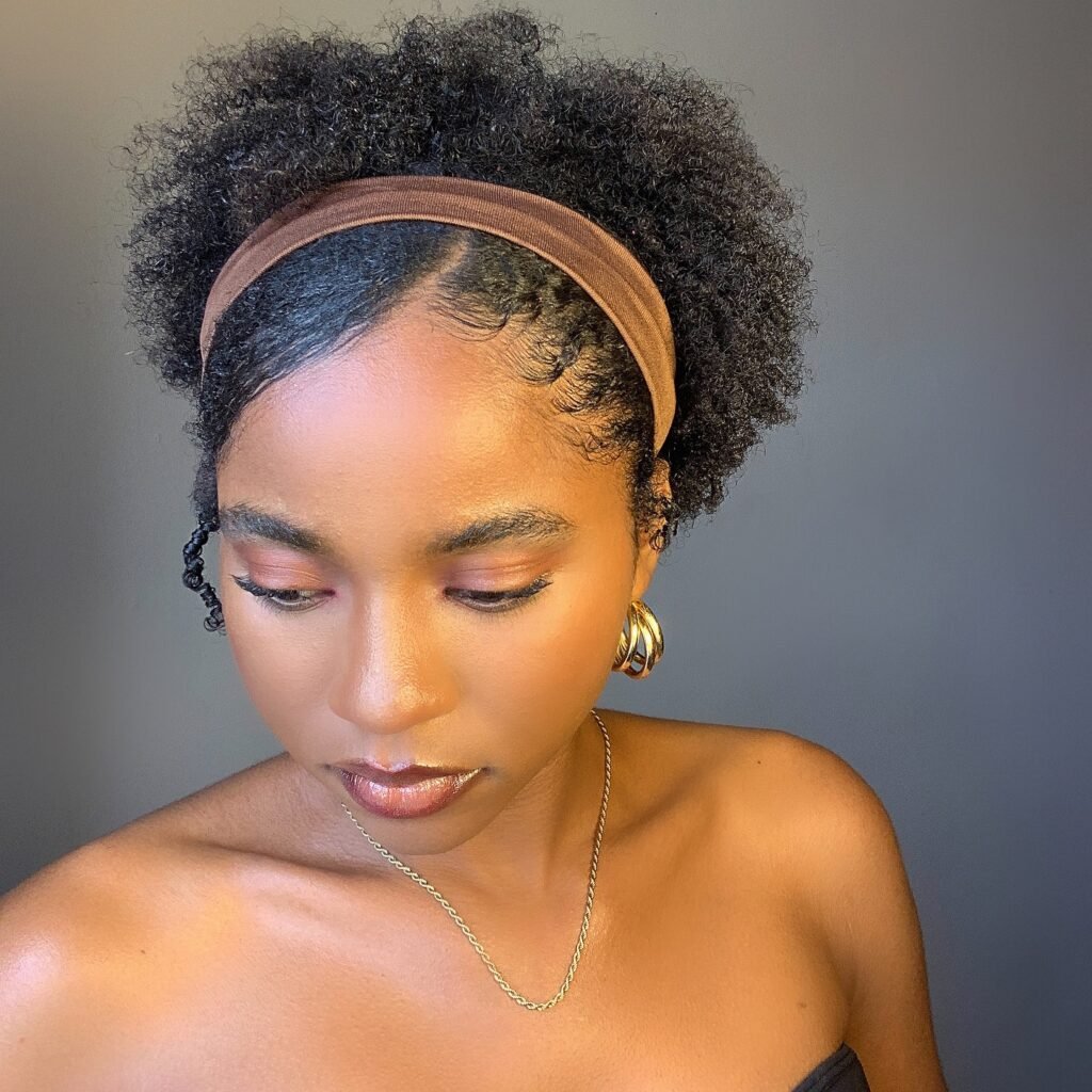 This style features a minimalist brown headband paired with a low, defined afro puff. It’s a clean, understated look that brings attention to the natural curl pattern.