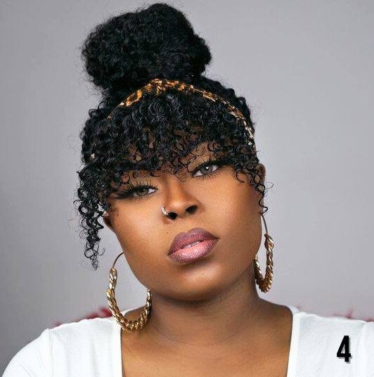 A leopard print headband adds flair to a high curly bun with loose, defined bangs at the front. This look is both trendy and practical, keeping the hair off the neck while framing the face with curly bangs.