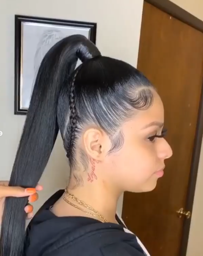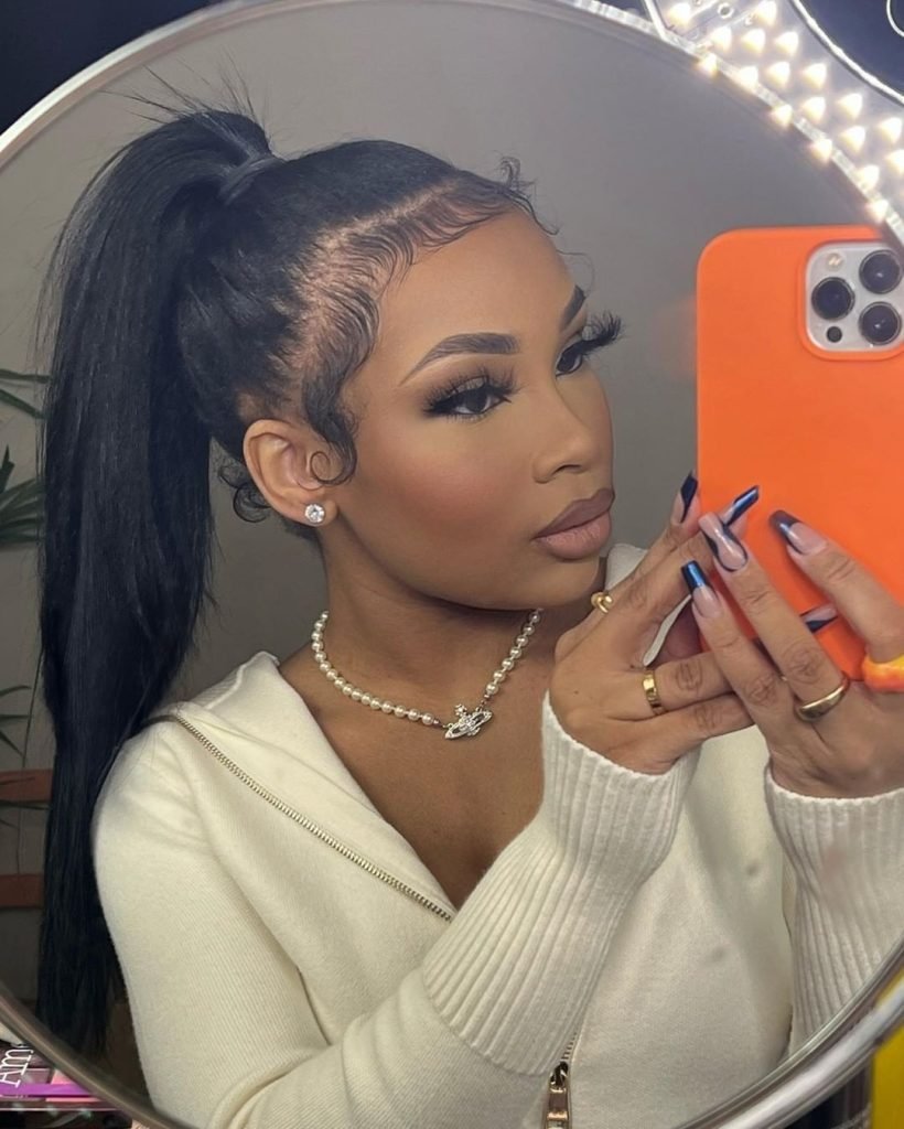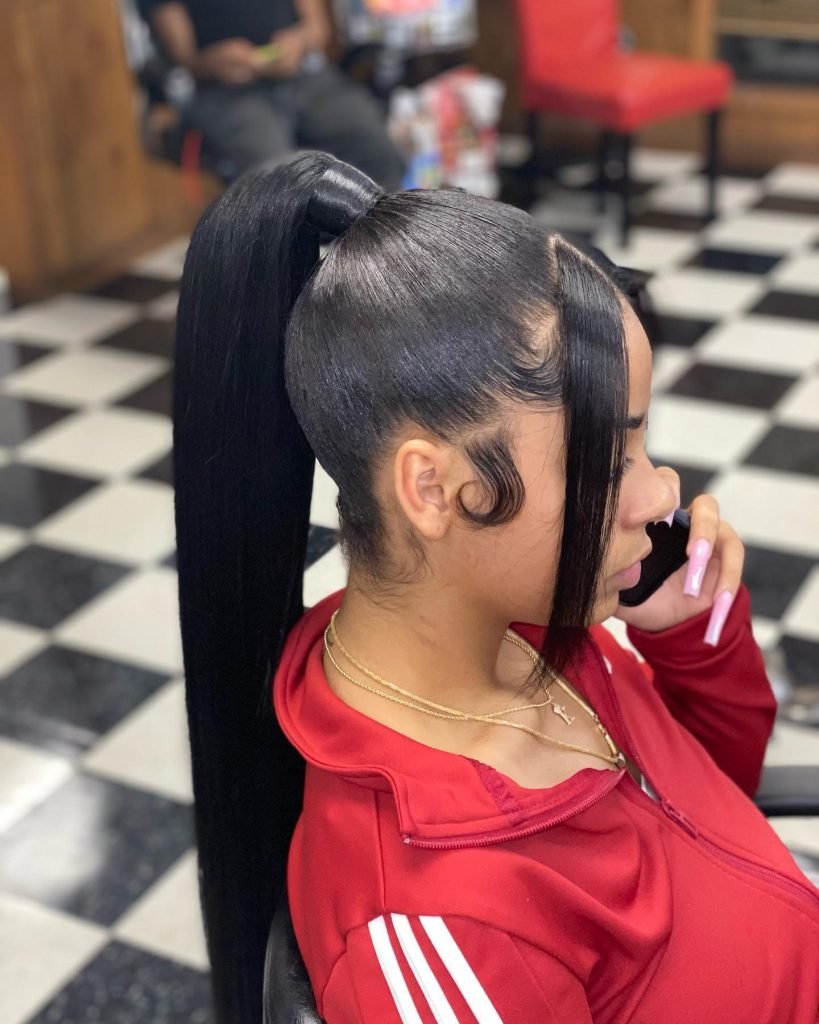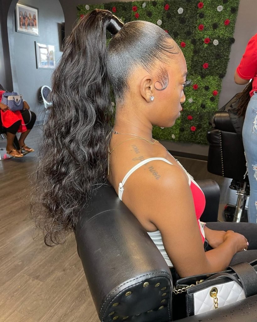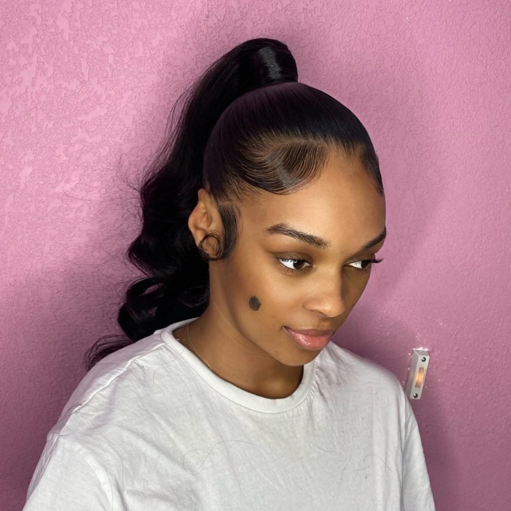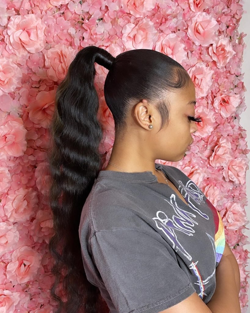 This sculpted-edge high ponytail features meticulously styled baby hairs and a smooth, shiny finish that enhances its sleek appeal. Perfect for adding a touch of urban glamour to your look.