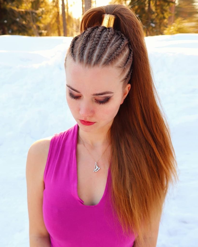 In this unique braided detail ponytail, the hair is accentuated with tightly woven braids along the scalp leading into a high ponytail. This style combines texture and sleekness, suitable for a dynamic appearance.