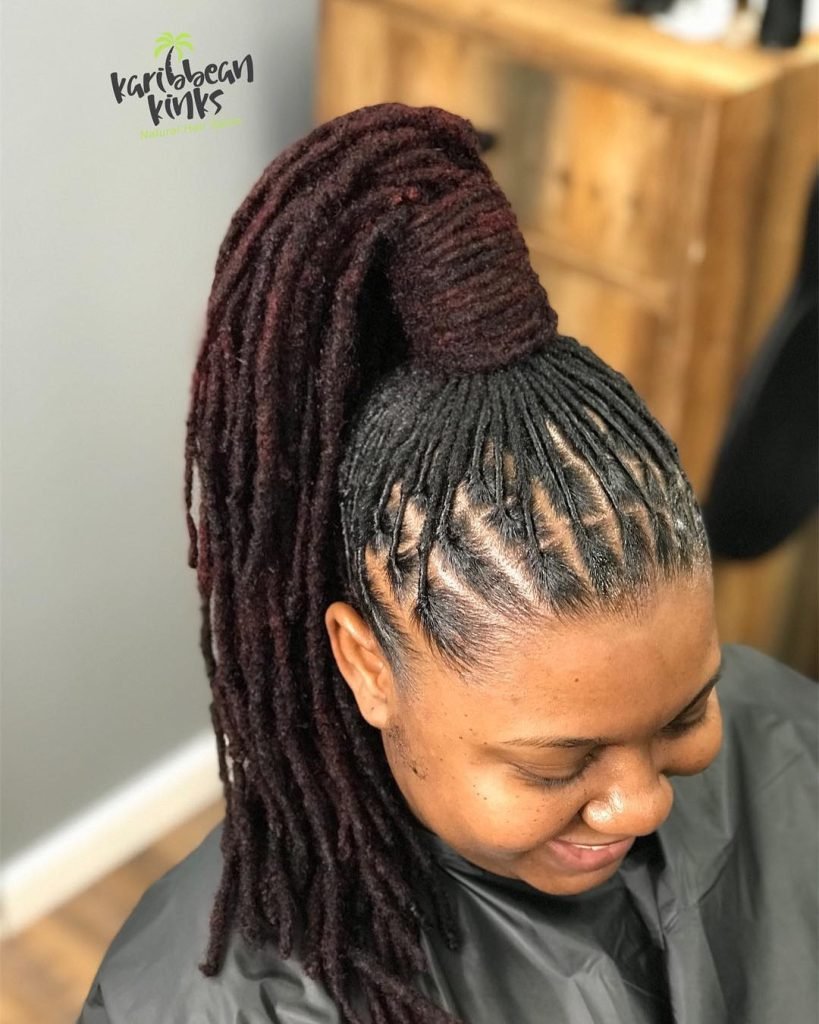 The dreadlocked high ponytail features meticulously styled dreads gathered into a high, cascading ponytail. This look is bold and expressive, showcasing a textured and voluminous style that is both modern and striking.