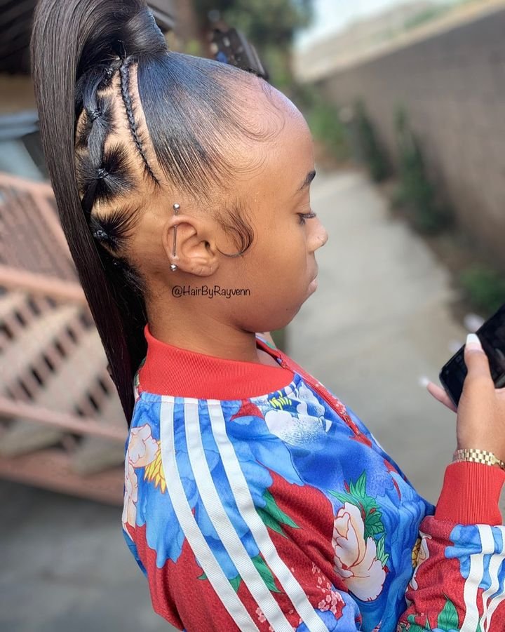 This creative braided high ponytail combines smooth hair with intricate cornrow braids along the scalp, leading up to a sleek ponytail. It’s a stylish choice that highlights precision and flair, perfect for showcasing personality.