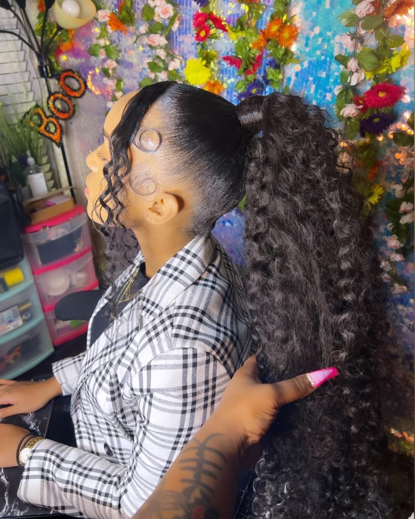 The curly volume high ponytail bursts with voluminous curls, creating a bold and dynamic effect. It’s an expressive style that combines texture and flair, suitable for making a fashion statement.
