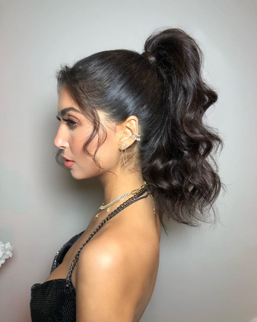 The curly high ponytail bursts with volume, featuring lush curls that provide a playful yet chic look. It’s secured at a high point, giving a flattering lift to the overall silhouette, perfect for stylish outings.