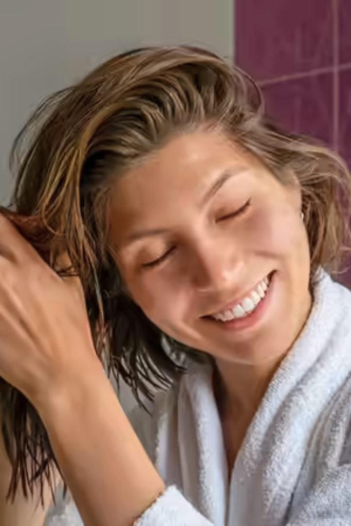 Begin by washing your hair with a clarifying shampoo to get rid of any oils and residue. Once clean, towel dry your hair to keep it damp but not dripping wet.