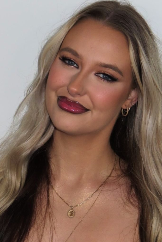 Use a peach-toned blush for a healthy flush. For the lips, opt for a glossy brown lipstick to complement the bronzed theme, adding volume and a touch of glamour.