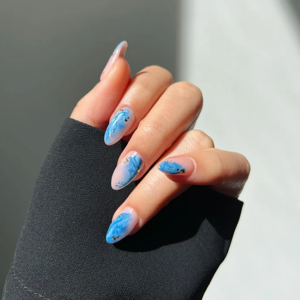 Bring the ocean to your fingertips with a dreamy blue marble design. Think swirling shades of turquoise, white, and deep blue, mimicking the sea’s rolling tides. Marble nails might look complicated, but using a simple water marbling technique or a fine nail brush makes it surprisingly achievable. I suggest investing in a nail art toolkit to help with precision.