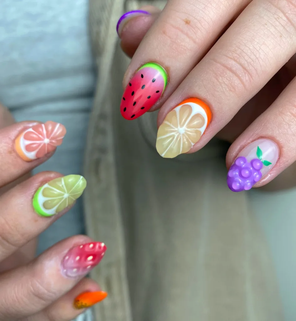 If you can’t decide on just one summer fruit, why not feature several? Watermelons, strawberries, cherries, and pineapples can all play together across your nails. Keep the base color simple to let the fruity designs pop. I recommend a nail art pen set to make drawing those tiny fruits easier and neater.