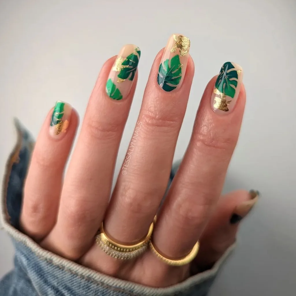 If you’re craving a tropical vacation, bring the island vibes to your nails with leafy green patterns. Palm fronds, monstera leaves, and even banana leaves look stunning against a pastel pink or creamy white backdrop. Nail stamping plates make this design so much easier and save tons of time.