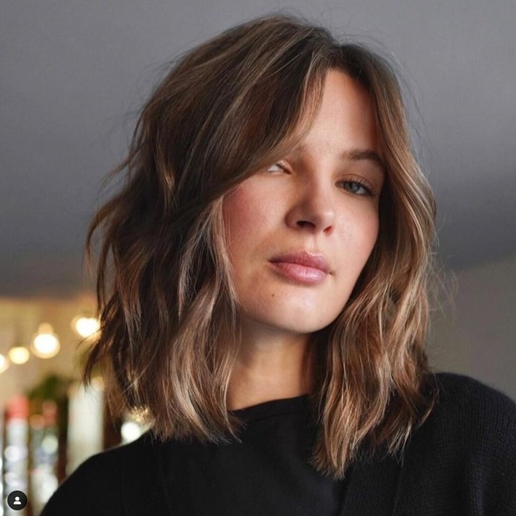 This layered lob with feathered ends and bangs adds an effortless, textured vibe to the style. The bangs soften the look, while the layers provide dimension and movement, making it perfect for wavy or straight hair types. The feathered ends ensure that the hair doesn’t look too bulky.