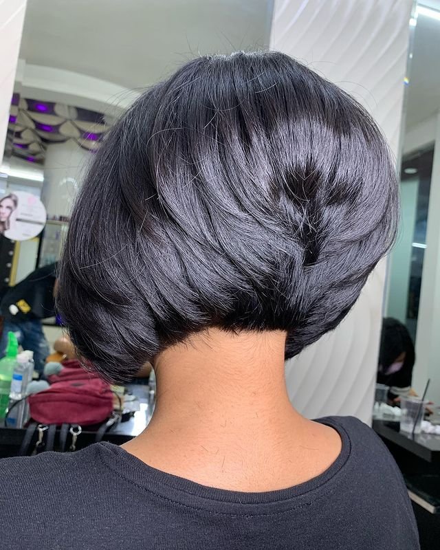 This cut works great for those with straight, thick hair as it gives the hair a sculpted look. To achieve this style, your stylist should focus on creating short layers at the back while leaving the front longer. Style with a round brush and blow-dry for a smooth, polished finish.