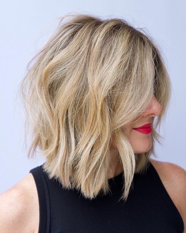 This messy textured lob is full of movement and volume, perfect for those who want a carefree, tousled look. The layers add depth and texture, creating a lived-in vibe. It’s an ideal choice for medium to fine hair types, as the layers boost body without weighing down the hair.