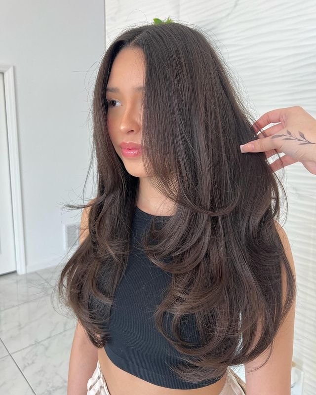 This style features long, voluminous layers with soft, wispy bangs, creating a chic, carefree look. The layers add movement throughout the hair, while the wispy bangs frame the face gently. To achieve this style, request long, cascading layers starting around the chin, with subtle bangs that blend into the hair.