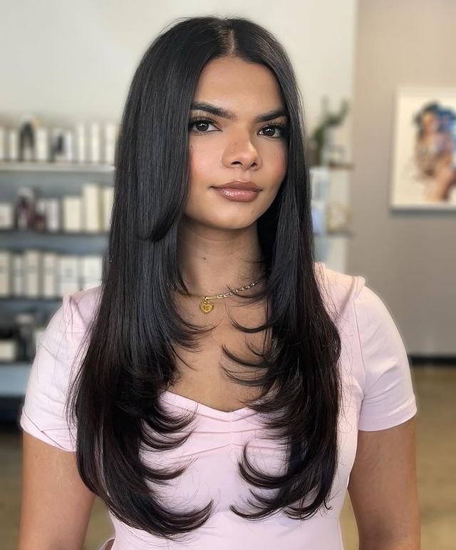 This look features face-framing layers that start around the cheeks and taper down. The middle part emphasizes the balance of the cut, making the hair look sleek and elegant. To recreate this look, ask for layers that start at the face and blend into the rest of the hair, keeping the middle part clean and sharp.