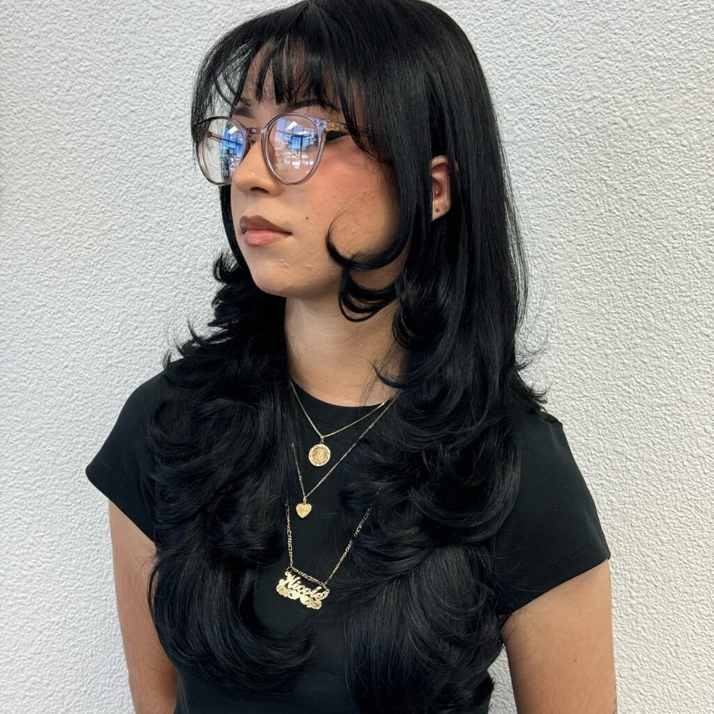 To recreate this hairstyle, ask for feathered layers that start mid-length and lightly frame the face, paired with bangs that blend seamlessly into the layers. Blow-dry using a round brush to lift the hair, and finish with a texturizing spray to maintain movement. This style is perfect for those who want to add volume and lightness to their long hair.
