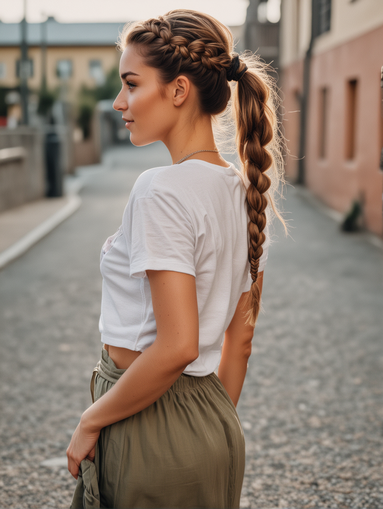 Add a regal touch to your ponytail with a braided crown. Braid a section of hair around the crown of your head before gathering all your hair into a low ponytail.