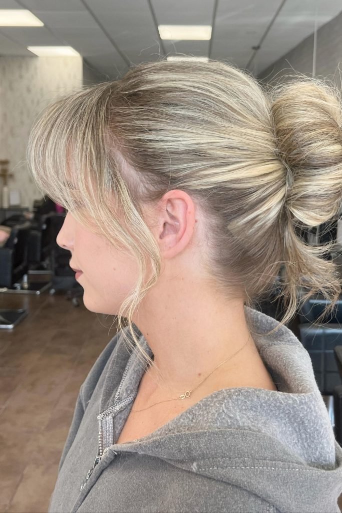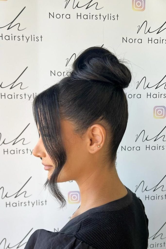 This hairstyle features a sleek high messy bun, combined with softly tousled bangs and loose strands framing the face.