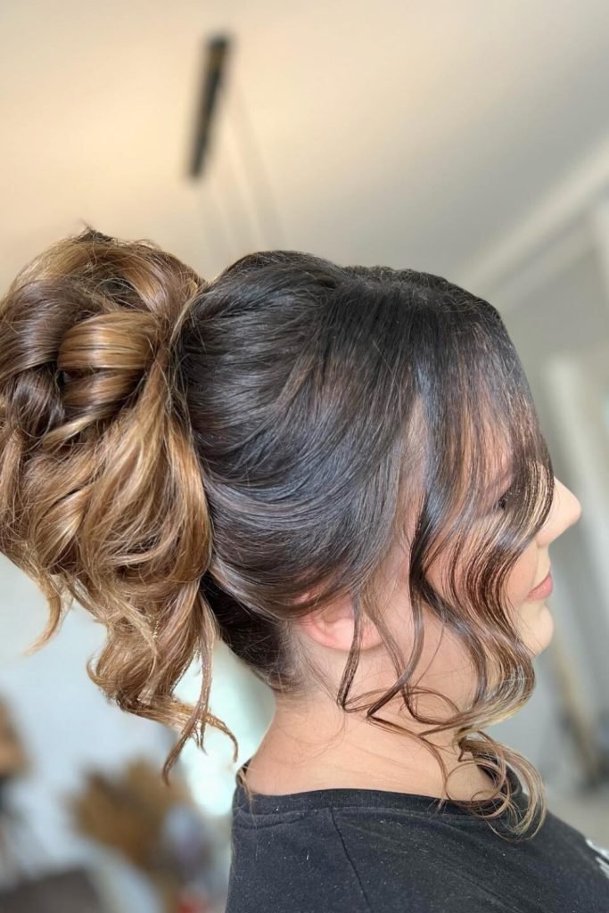 This hairstyle showcases a sleek high messy bun, blending sophistication with a touch of playfulness.