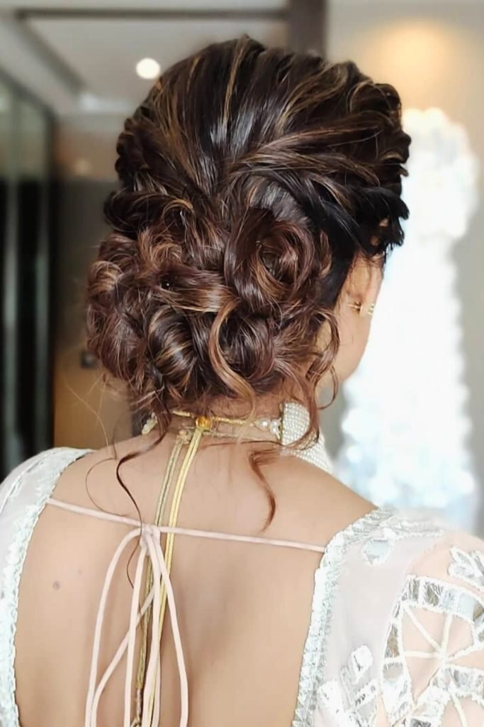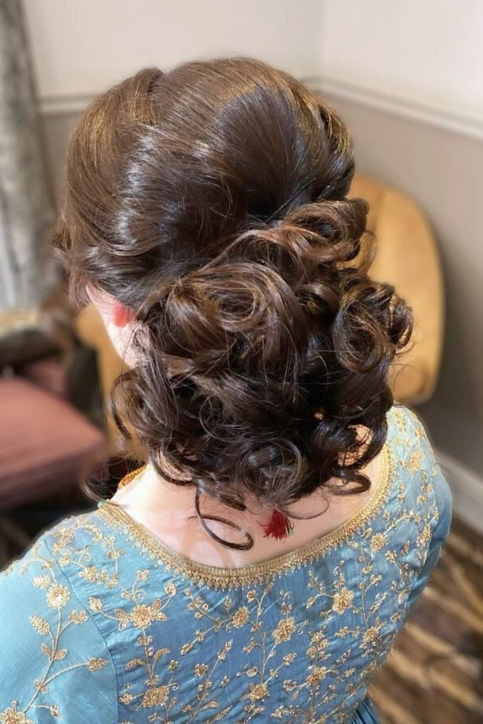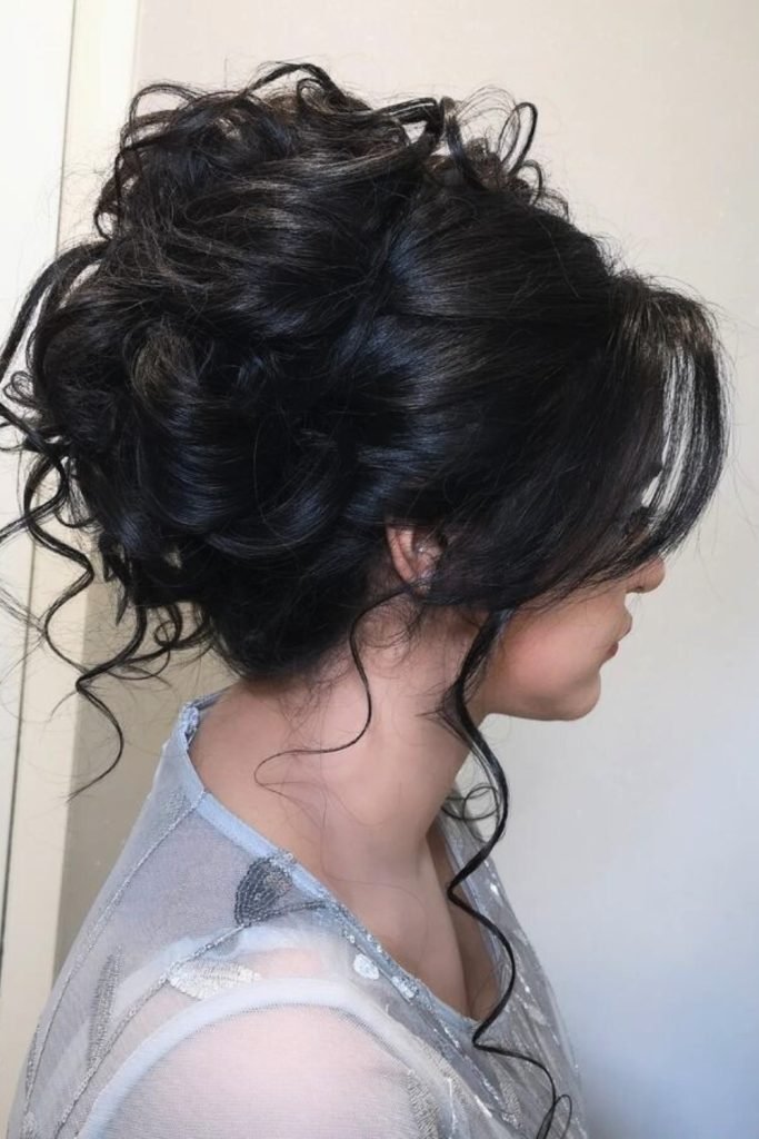 The curls add a dynamic texture, creating a soft and romantic look. Ideal for special occasions, this messy bun strikes the perfect balance between formal sophistication and effortless charm, making it a versatile and captivating choice for any event.