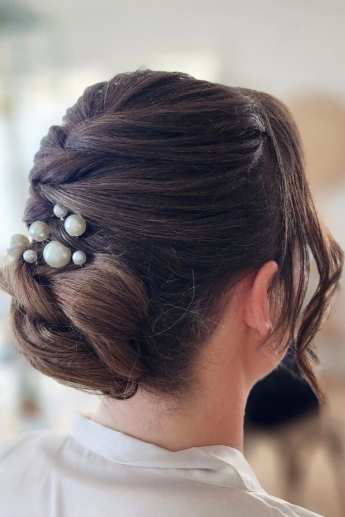 The hair is styled into a low bun with a slightly tousled finish, adorned with pearl accessories for a touch of sophistication. Loose strands softly frame the face, enhancing the overall look.