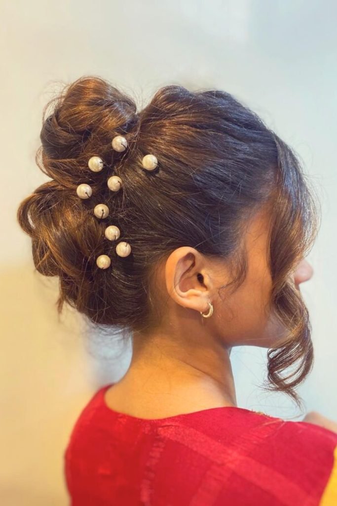 This hairstyle features a pearl-embellished messy bun, blending elegance with a contemporary twist.