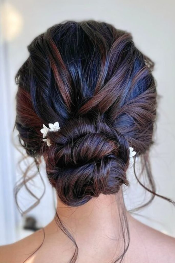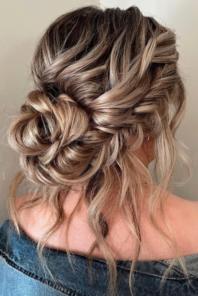 This hairstyle features a tousled low messy bun, exuding effortless elegance and casual charm.