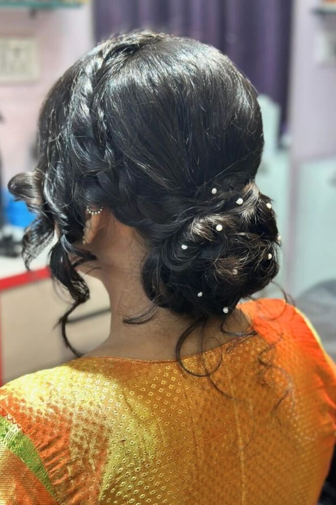This hairstyle features a pearl-adorned braided messy bun, combining elegance with a touch of whimsy.