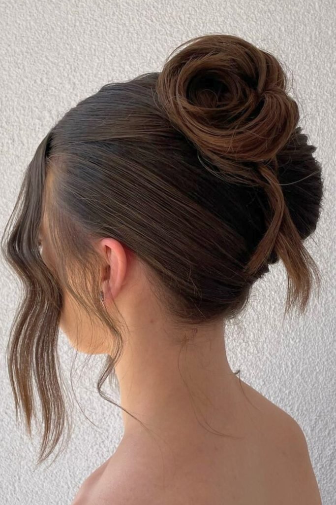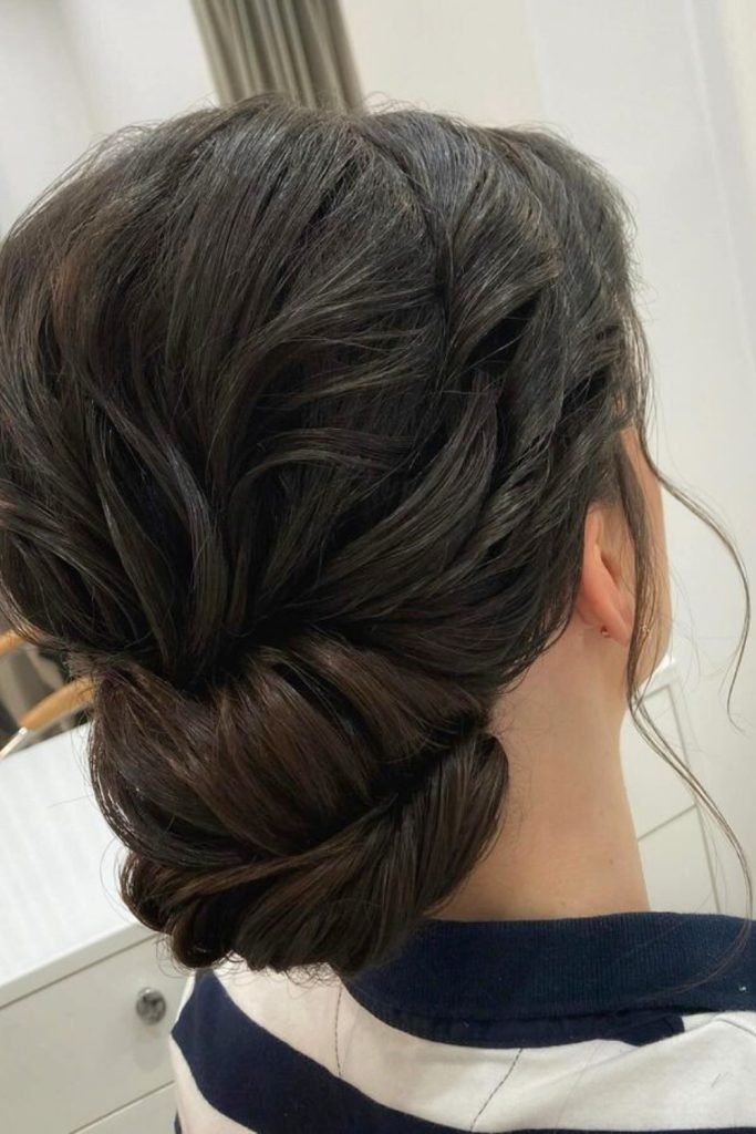 This hairstyle features a sleek twisted messy bun, combining elegance with a modern twist.