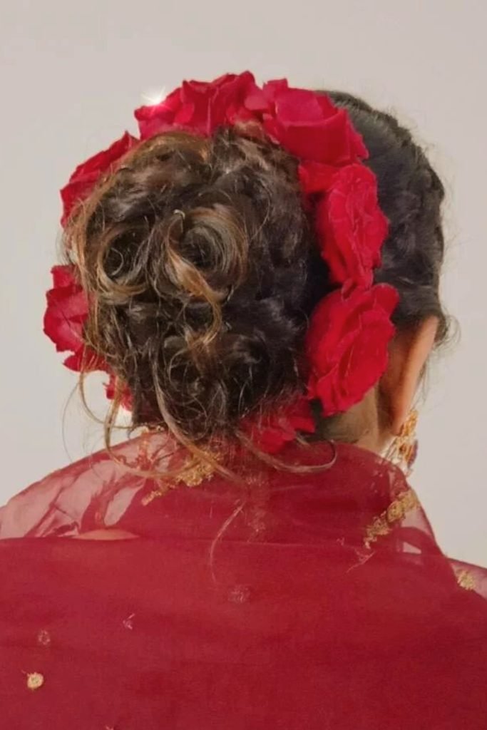 The hair is styled into a voluminous, textured bun with loose curls, surrounded by red flowers that create a striking contrast.