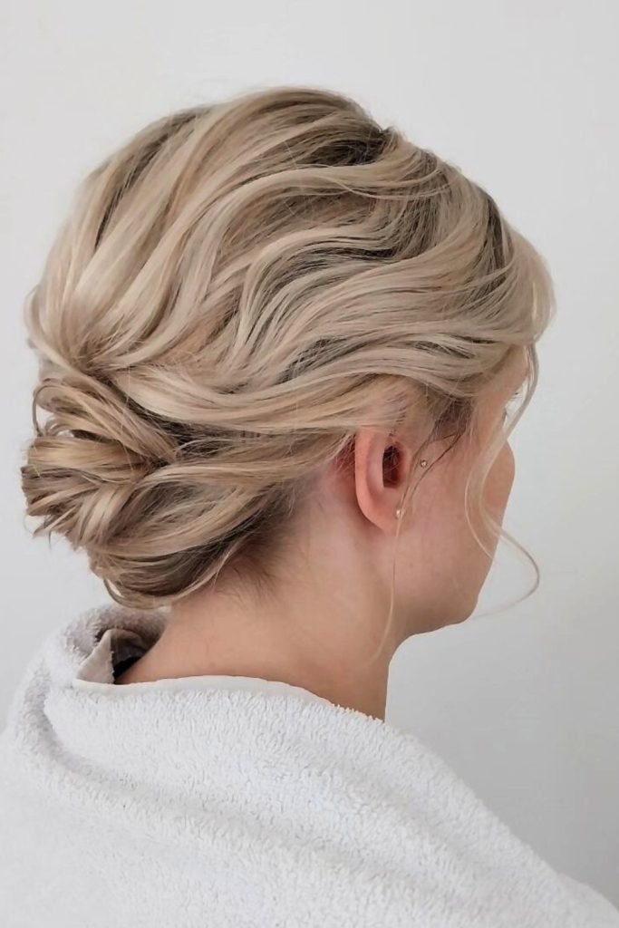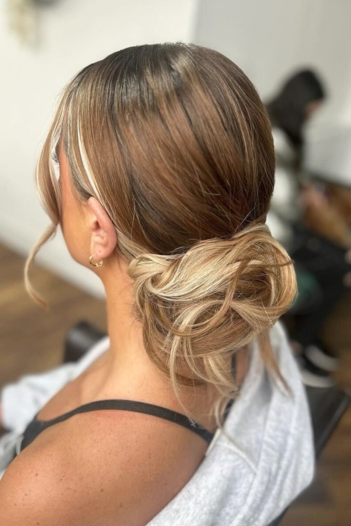 This hairstyle showcases an elegant low messy bun, perfect for adding a touch of sophistication to any ensemble.